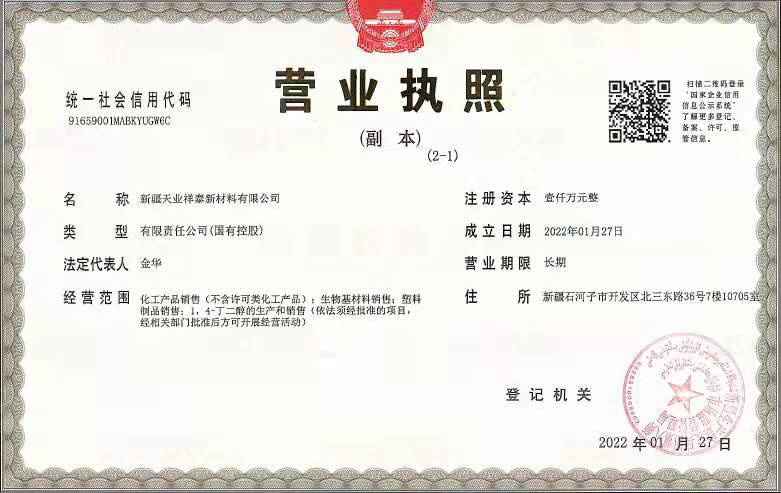 新疆天業(yè)祥泰新材料有限公司由東華科技與新疆天業(yè)(集團(tuán))有限公司共同設(shè)立,注冊資本金1000萬元,其中東華科技持股49%。經(jīng)營范圍包括化工產(chǎn)品銷售(不含許可類化工產(chǎn)品)、生物基材料銷售、塑料制品銷售、1,4-丁二醇的生產(chǎn)和銷售等業(yè)務(wù)。